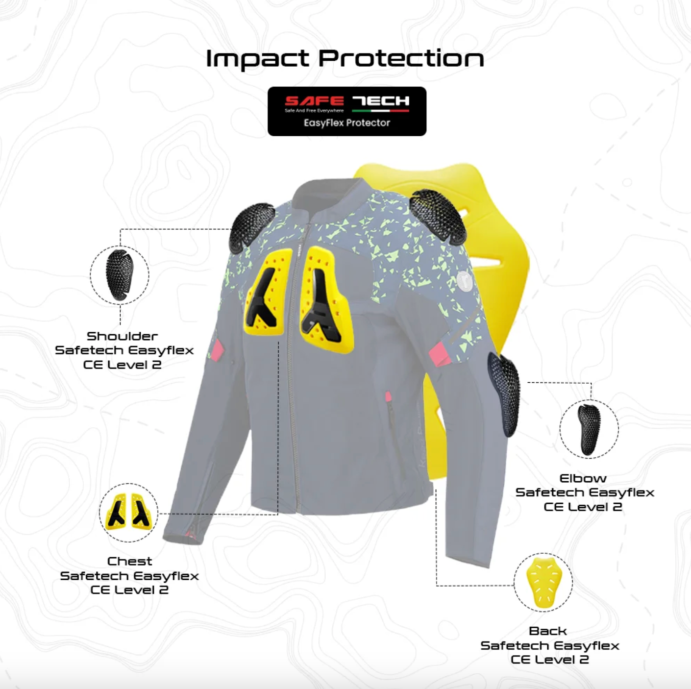 - Shoulders: EASYFLEX CE Certified Safetech (Italian) Level 2 Protectors used for ergonomics, lightweight, ultra flexibility. Oversized Certified to standard EN1621-1:2012 (T+)